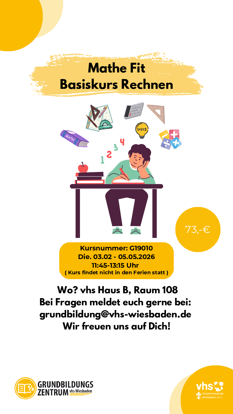 Das Grundbildungszentrum an der Wiesbadener Volkshochschule bietet verschiedene Kurse zum Lesen, Schreiben und Rechnen lernen, entwickelt bedarfsgerechte Lernangebote in verschiedenen Stadtteilen und schafft einfache Zugangsmöglichkeiten für Lerninteressierte. Sie werden unterstützt bei der Verbesserung der Lese-, Schreib- und Rechenkompetenzen sowie der digitalen Kompetenz und der Gesundheitsbildung.